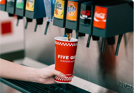 Complete your Five Guys meal with a crisp, cold beverage. We proudly serve Coca-Cola and Dr Pepper products