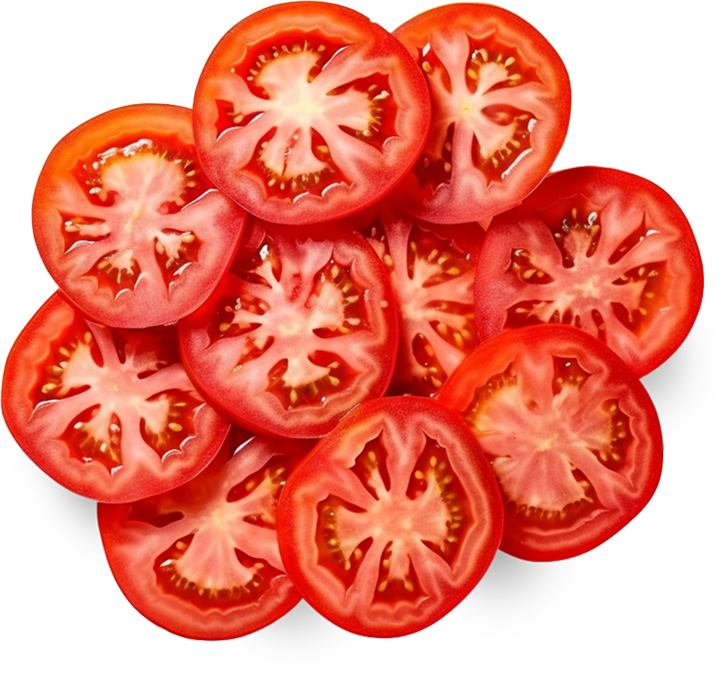 Two slices for an even tomato-to-bite ratio every time. Sliced fresh daily.